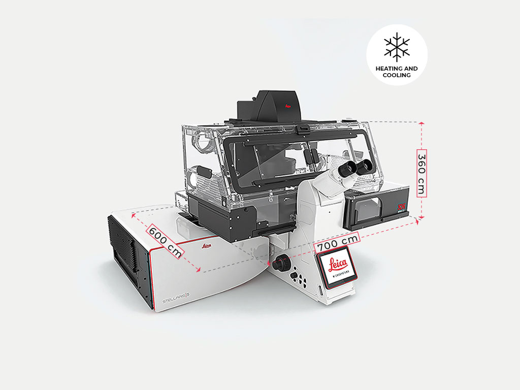 Heating and Cooling transparent microscope incubator for DMi8 with STELLARIS to control the temperature in a large volume around the microscope in the range 45°c to 10° below room temperature.